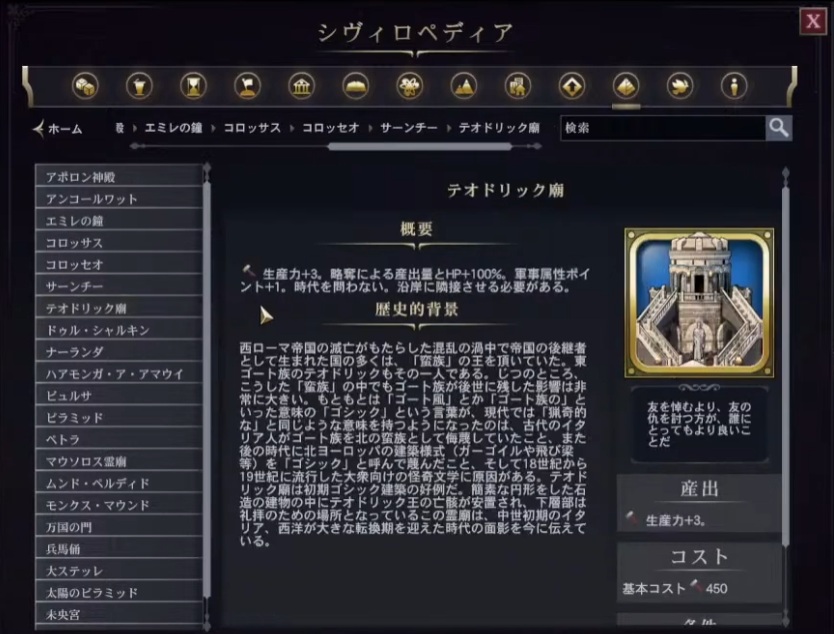 一方で解禁条件は識字とかなり奥の方にあり、古代で文化力が他国を圧倒している展開でないと自力建設は困難です。前述のアッシリアは刻筆の伝統があるものの、文化力のプラス要素が無いので識字にたどり着く頃には他国に建てられている公算が大。