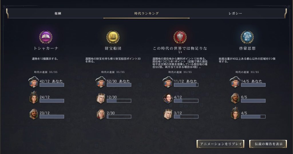 現状、探検時代の文化レガシーパス(遺物12個)は達成が容易で、宗教の布教を頑張れば遺物を30個以上集められることも。遺物を30個集めれば6,000ゴールド稼げるため、国庫が大きく潤います。